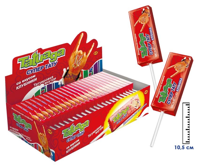 Жевательная конфета на палочке Tatuaga с тату Клубника (Пакистан) 10г0,00 руб. за штуку (в упак. 50 шт.) |